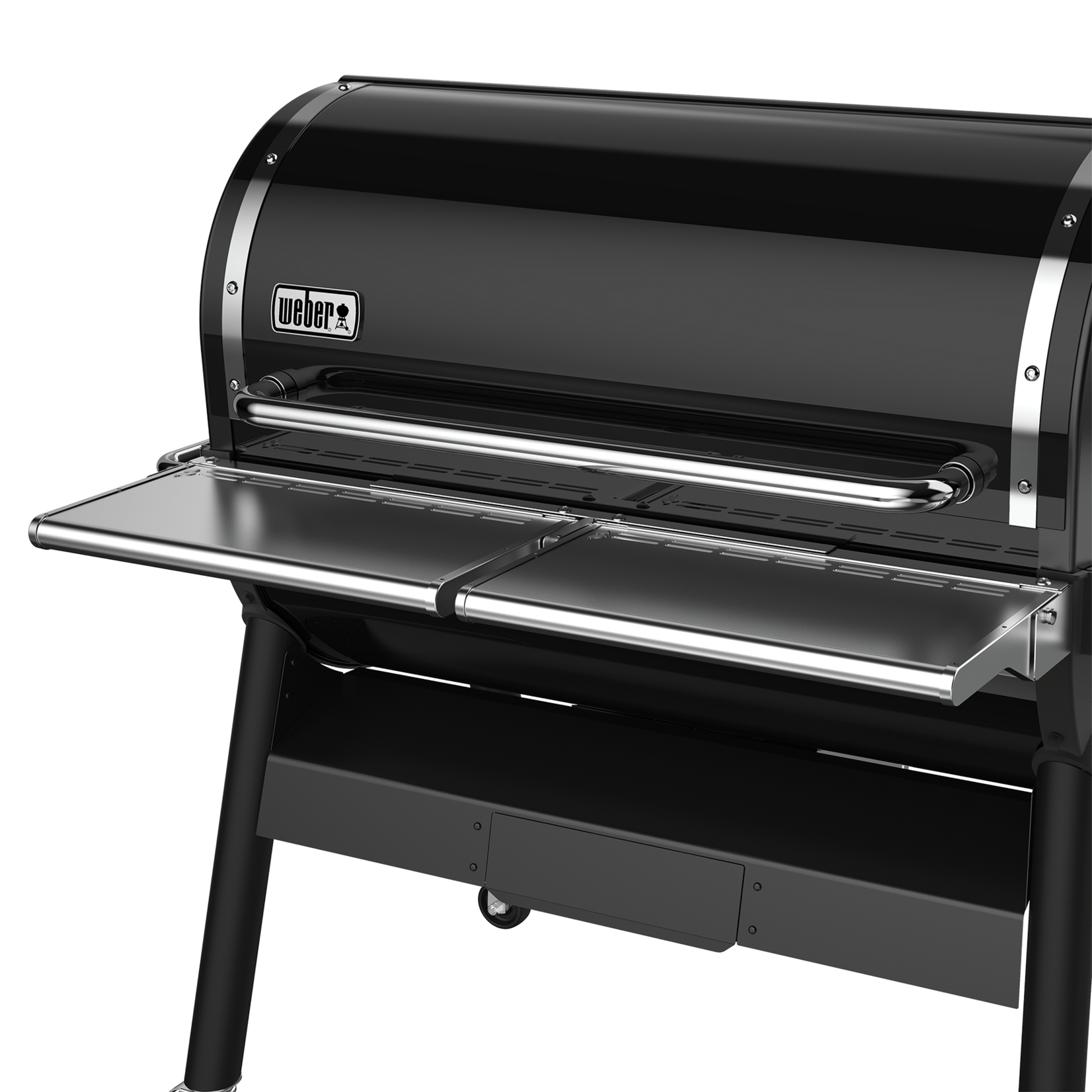 The stainless steel front shelf adds over 2,250 cm2 of extra work space. It accommodates up to 9 kg per shelf, for food and BBQ necessities including tools, platters, and cutting boards. The clips underneath are specifically designed to hold the upper cooking rack when not in use.